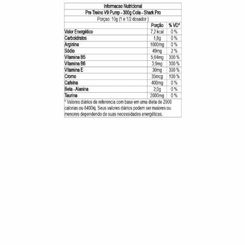Apresentamos o V9 PUMP Shark Pro, o pré-treino definitivo, desenvolvido para proporcionar resultados extraordinários. Sua fórmula avançada combina de forma estratégica beta-alanina, arginina, taurina e cafeína, aliados a vitaminas e minerais essenciais para otimizar o desempenho.